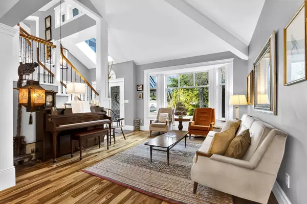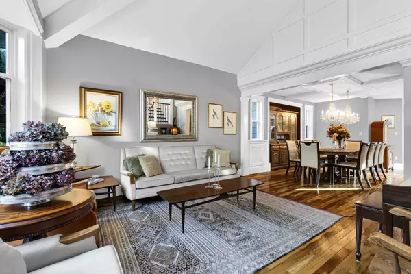 Outdoors, indulge in professionally landscaped grounds with perennial gardens, fruit trees, and a spectacular 900-square-foot deck complete with a built-in TV, speakers, and electric awnings—perfect for luxurious entertaining.