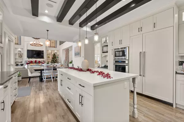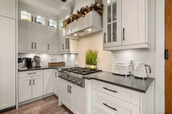 The gourmet chef’s kitchen is equipped with premium Thermador stainless steel appliances, a large walk-in pantry, and a fully appointed spice kitchen—perfect for entertaining at any scale.